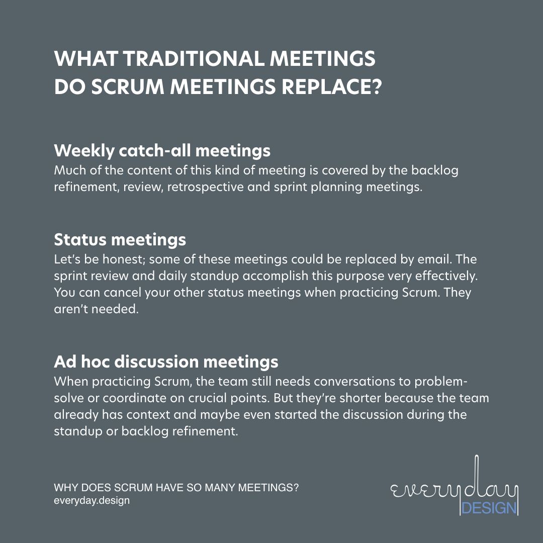 These kinds of meetings are the type that sneaks in and takes over most people’s calendars. They are the 1-hour meeting to discuss a specific topic the team is working on. When practicing Scrum, the team still needs conversations to problem-solve or coordinate on crucial points. But they tend to be shorter interactions, like a 15-minute conversation or a slack message. They already have context and maybe even started the discussion during the standup or backlog refinement. These ad hoc meetings can be both shortened and less frequent.